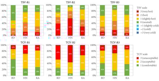 In R1, the OTC in BD was markedly inferior than that of HN and RA. In BD, the proportion of respondents selecting TSV = −3 (very cold) was significantly higher by 18% and 17% than that in HN and RA, respectively. Similarly, the proportion selecting TCV = 3 (unacceptable) was 10% and 14% higher than in HN and RA, respectively. Additionally, the mTSV and mTCV of BD were significantly higher than those of the other two districts. The proportion of respondents in RA selecting TSV = 0 (neutral) and TCV = 1 (comfortable) was 14% and 11% higher, respectively, than that in HN. Additionally, RA exhibited superior mTSV, mTCV, and mTg to HN. Therefore, it can be inferred that the OTC of RA in the morning was slightly better than that of HN.