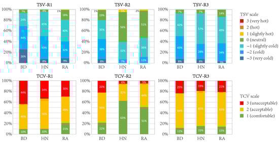 In R2, the OTC disadvantage in BD was more pronounced than that in R1. Compared to HN and RA, the mTSV of BD was lower by 0.89 and 0.75, its mTCV was higher by 0.58 and 0.47, and its mTg was lower by 5.6 °C and 4.8 °C, respectively. During this period, the OTC conditions of HN were slightly better than those of RA. In addition to having a higher proportion of respondents selecting TSV = 0 and TCV = 1, the mTSV of HN was 0.14 higher than that of RA, while its mTCV was 0.11 lower.