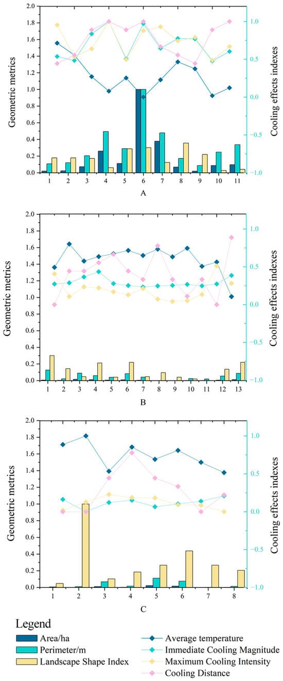- Li, Y.; Ren, C.; Ho, J.Y.; Shi, Y. Landscape Metrics in Assessing How the Configuration of Urban Green Spaces Affects Their Cooling Effect: A Systematic Review of Empirical Studies. Landsc. Urban Plan. 2023, 239, 104842. [Google Scholar] [CrossRef]