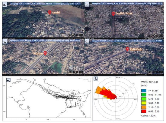 The sampling sites represented via the satellite images obtained from Google Earth (https://earth.google.com/web; accessed on 1 July 2025): (a) Amriti; (b) English Bazar; (c) Sujapur; (d) Kaliachak. (e) Air mass backward trajectory data of the study area during the study period (December 2023–February 2024) was obtained using the NOAA HYSPLIT model. (f) The wind rose diagram illustrates the wind patterns of the study area during the study period (December 2023–February 2024).