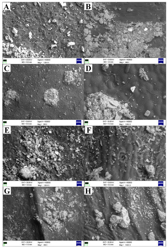 Scanning electron microscopic (SEM) representations showed the heterogeneous mixture of different-sized dust particles deposited on the leaf surfaces. The following plant species showed dust accumulation in and around stomata that block the stomata, disturbing the plants’ physicochemical activity and altering the microenvironment of the leaf surfaces: (A,B) Mangifera indica L., (C,D) Moringa oleifera Lam., (E,F) Aegle marmelos (L.) Correa, and (G,H) Azadirachta indica A. Juss.