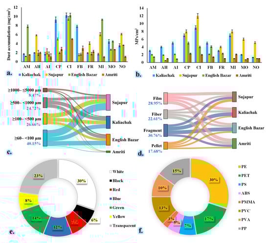Total dust load (a) and MP abundance (b) in different species. MP diversity at different sampling sites: (c) size, (d) shape, (e) color, and (f) polymer abundance throughout the study period. Kaliachak: suburban type, dense population, and small number of plastic recycling factories; Sujapur: suburban type, moderate-level population density, and large number of plastic recycling factories; English Bazar: urban type, dense population; Amriti: rural type and lower population density. AM: Aegle marmelos (L.) Correa; AH: Artocarpus heterophyllus Lam.; AI: Azadirachta indica A. Juss.; CI: Clerodendrum infortunatum L.; CP: Calotropis procera (Aiton) W.T. Aiton; FR: Ficus religiosa L.; FB: Ficus benghalensis L.; MO: Moringa oleifera Lam.; MI: Mangifera indica L.; NO: Nerium oleander L.