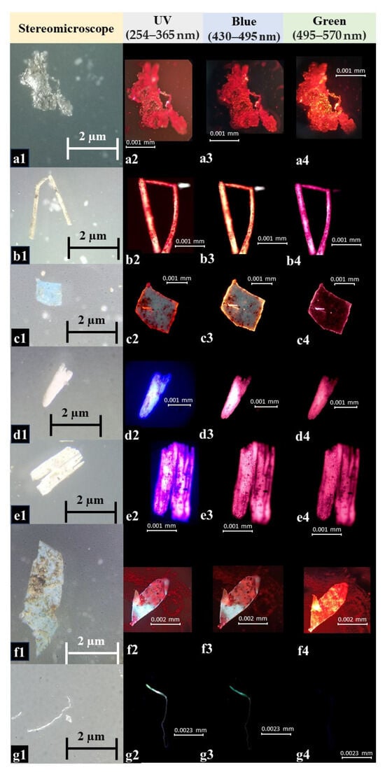 Fluorescent microscopy images of selected microplastics from leaf phyllosphere, which show the different sizes of microplastics. The fluorescent microscopy images are taken with different filters; based on the fluorescent intensities in different filters, the probable polymer type can be identified []. (a) Film type with white color (a1): PE/PP/PA/PU/PS with strong (a2–a4; in UV, blue, and green) fluorescence intensity; (b) fiber type with white color (b1): PE/PP/PA/PU/PS with strong (b2–b4; in UV, blue, and green) fluorescence intensity; (c) fragment type with blue color (c1): PE/PP/PA/PU/PS with strong (c2–c4, in UV, blue, and green) fluorescence intensity; (d,e) fragment type with white color (d1,e1): PE/PP/PA/PU/PS with strong (d2–d4,e2–e4; in UV, blue, and green) fluorescence intensity; (f) fragment type with blue color (f1): PE/PP/PA/PU/PS with strong (f2–f4; in UV, blue, and green) fluorescence intensity; (g) fiber type with white color (g1): CA with strong (g2,g3; in UV and blue) and weak (g4; in green) fluorescence intensity. PE: Polyethylene; PP: Polypropylene; PA: Polyamide; PU: Polyurethane; PS: Polystyrene; CA: Cellulose acetate.