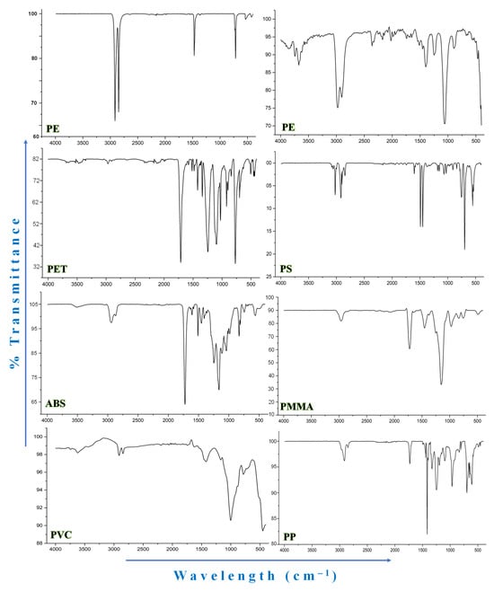Selected FTIR graphs of microplastics. PE: Polyethylene; PMMA: Polymethyl methacrylate; PET: Polyethylene terephthalate; PS: Polystyrene; PVC: Polyvinyl chloride; PP: Polypropylene; ABS: Acrylonitrile Butadiene Styrene.