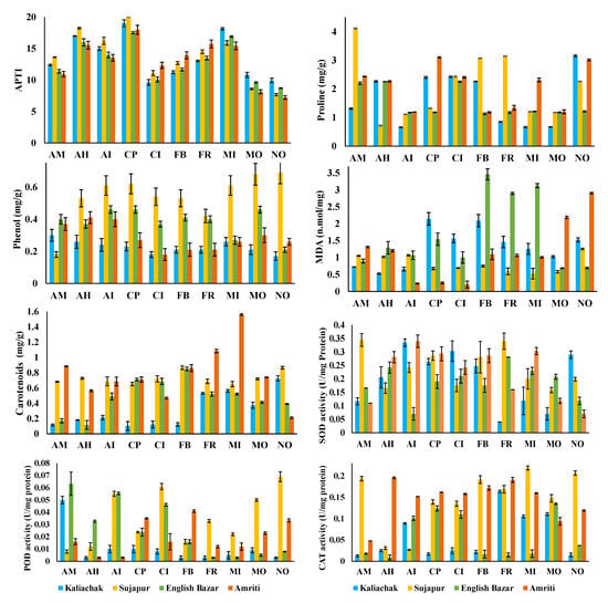 APTI and non-enzymatic antioxidant (proline; phenol; MDA: malondialdehyde; and carotenoids) and enzymatic antioxidant (CAT: catalase; POD: peroxidase; and SOD: superoxide dismutase) activity in different plant species. Kaliachak: suburban type, dense population, and small number of plastic recycling factories; Sujapur: suburban type, moderate-level population density, and large number of plastic recycling factories; English Bazar: urban type and dense population; Amriti: rural type and lower population density. AM: Aegle marmelos (L.) Correa; AH: Artocarpus heterophyllus Lam.; AI: Azadirachta indica A. Juss.; CI: Clerodendrum infortunatum L.; CP: Calotropis procera (Aiton) W.T. Aiton; FR: Ficus religiosa L.; FB: Ficus benghalensis L.; MO: Moringa oleifera Lam.; MI: Mangifera indica L.; NO: Nerium oleander L.