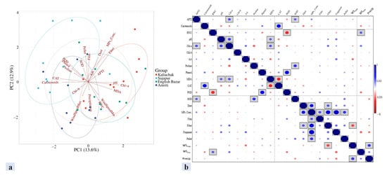 (a) Principal component analysis (biplot) and (b) correlation analysis among the amount of DDMP, wind speed, precipitation, and various biochemical parameters in plants of the study area. WSmax: wind speed maximum; WSmin: wind speed minimum; Precip: precipitation; APTI: air pollution tolerance index; RWC: relative water content; Chl: chlorophyll; MDA: malondialdehyde; CAT: catalase; POD: peroxidase; SOD: superoxide dismutase; MPs_Conc.: microplastic concentration.