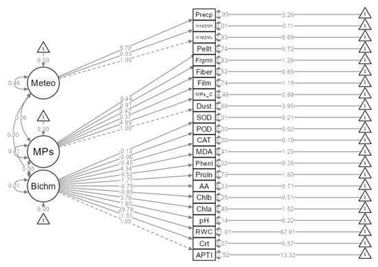 A secondary finding of this study, as represented via the structural equation mode (Figure 8), is that between the biochemical parameters and the effect of microplastics on the meteorological parameters, there were significant differences. This demonstrates that the size and makeup of the various MP categories (forms) may be causing plants to exhibit selective accumulation of MPs. The varying magnitude of MP production at various locations might also be the cause of this phenomenon. Therefore, differences in spatial scale are important for the production of MPs in the air as well as for their deposition on plant leaves (Figure 2).