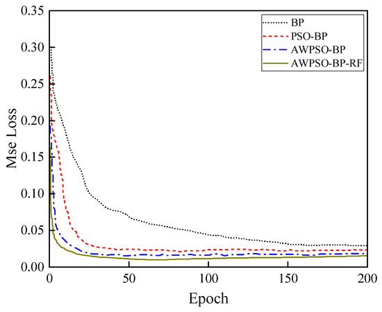(4) Through comparison experiments, it is found that the proposed RF-AWPSO-BP hybrid model greatly improves the prediction performance, and the predicted and true values exhibit a strong fitting degree.