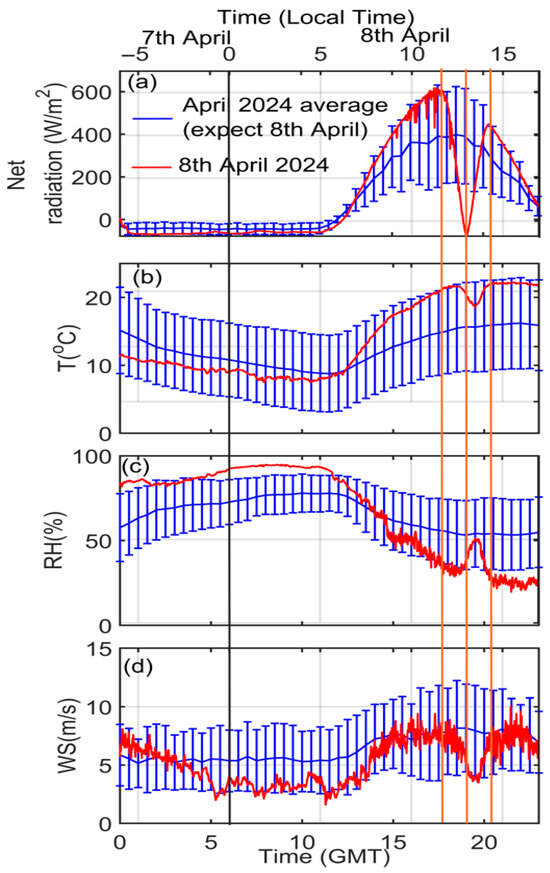 Diurnal monthly mean time series of Net Radiation (a), surface temperature (b), relative humidity (c), and wind speed (d) observed over April 2024 (blue line) and on 8 April 2024 (solar eclipse day, red line) over Bondville, IL, USA. This data was obtained from the SURFRAD (Surface Radiation Budget) Network (https://gml.noaa.gov/grad/surfrad/overview.html (accessed on 14 July 2025)). The vertical black line differentiates 7 April and 8 April 2024. The orange vertical lines show the beginning of the solar eclipse, total solar eclipse, and end of the solar eclipse over Bondville, IL, USA.