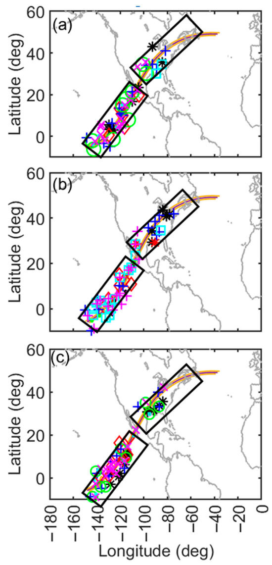 Spatial distribution of COSMIC2 GPS RO profiles on (a) 7 April 2024, (b) 8 April 2024, and (c) 9 April 2024 along with solar eclipse path. Black symbol denotes −3:2 h before eclipse, red symbol denotes −2:1 h before eclipse, blue symbol denotes 1–0 h before eclipse, green symbol denotes 0–1 h after eclipse, cyan symbol denotes 1:2 h after eclipse, magenta symbol denotes 2–3 h after eclipse.