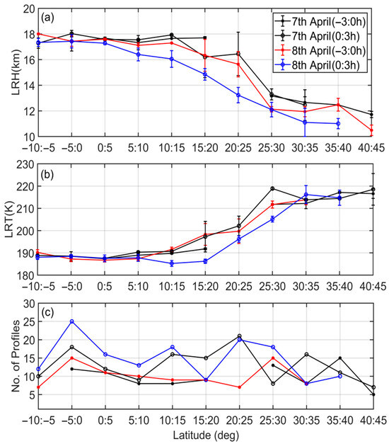 Lapse rate tropopause temperature (a) and altitude (b) variability ±3 h before and after the solar eclipse during 7–8 April 2024 along with a number of profiles obtained for each latitude grid (c).