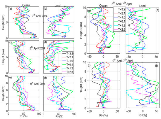 Vertical profiles of relative humidity during 7–9 April 2024 (a–f) and their difference between 8th April and 7th April (g,h) and 9th April and 7th April (i,j) for two different grids (as shown in Figure 1) with ±3 hour time window with respect to eclipse path time from COSMIC2 GPSRO observations.