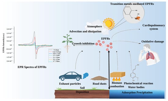 Free radicals are atoms or molecules that contain one or more unpaired electrons, a unique electronic configuration that imparts distinctive chemical reactivity [1,2]. These species include simple entities such as hydrogen atoms (with a single unpaired electron) and transition metal ions, such as iron, copper, and manganese [3,4]. The charge states of free radicals exhibit diversity, appearing as anionic radicals (negatively charged), cationic radicals (positively charged), or neutral radicals (charge-neutral) [5]. These distinct charge states dictate their differential reactivity and behavior in chemical processes [6]. For example, anionic radicals possess a greater electron-accepting capacity, while cationic radicals are more prone to donate electrons [6,7]. Neutral radicals exhibit dual redox properties, functioning as either oxidizing or reducing agents depending on the reaction conditions [4,8]. Historically, the scientific community has acknowledged that the unique electronic structure of free radicals underlies their strong bonding tendencies and high chemical reactivity, which results in their transient existence—designation as “ephemeral radicals” [9,10]. This transient nature presented significant challenges for isolation and characterization until the advent of advanced spectroscopic techniques [11]. During the 1950s, researchers discovered that positive radicals generated from emissions of coke and coal combustion exhibited prolonged stability [12], leading to their designation as Persistent Free Radicals (PFRs). While Harmon’s paradigm-shifting hypothesis initially lacked molecular validation, subsequent studies identified hydroxyl radicals (•OH) as key mediators of radiation-induced DNA strand breaks (e.g., via Fenton chemistry) and oxidative modifications to mitochondrial lipids as drivers of aging-related metabolic decline. Later investigations into tobacco smoke and carcinogenesis identified EPFRs as key constituents of cigarette smoke [13], while structurally analogous radicals were later detected in combustion-derived organic matrices, including charred biomass and diesel soot [14]. In recent years, studies have shown that significant quantities of EPFRs, including semiquinones, phenoxyl radicals, and cyclopentadienyl radicals, are substantially generated during the cooling phases of combustion or other thermal processes [15,16]. Adsorption of free radicals onto particulate matter surfaces significantly enhances their stability (from days to years), enabling quasi-infinite environmental persistence [16,17,18]. Their ubiquity in environmental matrices impacts ecosystems and human health (Figure 1) [19,20,21]. The number of papers indexed by Web of Science with the keyword “environmentally persistent free radicals” has increased greatly since 1998. Considering the importance of the pollutant, a review is thus urgently needed to summarize the current understanding and knowledge on EPFRs and, more importantly, provide guidance for future research.