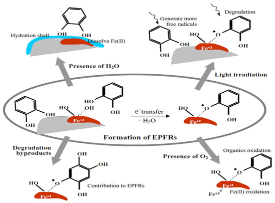 The persistence of EPFRs was modulated by interfacial interactions with transition metals (such as Fe) (Figure 2). Three key environmental variables exhibit divergent stabilizing and destabilizing effects: (i) Oxygen dynamics and molecular oxygen (O2) played dual roles through the redox cycling of Fe(II)/Fe(III). In this process, reactive oxygen species (e.g., •OH generated via the reaction Fe2+ + H2O2 → Fe3+ + •OH + OH− under acidic conditions) facilitated the degradation of organic compounds to produce radical intermediates. Concurrently, the reduction of Fe(III) occurs—mediated by agents such as O2•− or semiquinones—which serves to regenerate Fe(II). (ii) Hydrological interactions mediate the destabilization of EPFRs through three distinct mechanisms: (a) the formation of hydration shells that sterically hinder radical recombination; (b) competition with organic pollutants for catalytically active sites; and (c) reductive dissolution of transition metal oxides, which reduces the availability of redox-active sites; (iii) photonic influences: solar irradiation drives paradoxical effects. Light irradiation promotes the degradation of organic chemicals and thus the generation of organic byproducts, including organic free radicals, which may contribute to the additional EPFR signals. On the other hand, direct light irradiation on EPFRs may facilitate their decay as well.