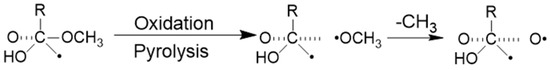Under conditions of light or heat, the ether bonds and carbon–carbon bonds within lignin undergo cleavage, initiating a cascade of radical-forming reactions (Figure 3). This process generates diverse free radical intermediates—including phenoxyl radicals (PhO•), methyl radicals (CH3•), and other short-lived species—that undergo structural reorganization and stabilization. These intermediates play a critical role in EPFR formation: For instance, the cleavage of the C-O bond in a methoxy group (-OCH3) yields a phenoxyl radical (PhO•) and a methyl radical (CH3•) (Equation (1), Equation (2)). The phenoxyl radical reacts with molecular oxygen (O2) to form a peroxyl radical (PhOO•) (Equation (3)), a reactive intermediate that can either rearrange or interact with other radicals. Notably, the phenoxyl radical may undergo hydrogen transfer with an adjacent carbon atom, stabilizing into a cyclic structure that lowers its energy state (Equation (4)). When this reaction occurs in the presence of water molecules and is driven by energy inputs (e.g., light or heat), it ultimately produces phenolic hydroperoxides (PhOOH) and hydroxyl radicals (HO•) (Equation (5)). These products, along with stabilized radicals from other pathways, contribute to the pool of environmentally persistent free radicals (EPFRs), whose longevity and reactivity pose significant environmental and health risks. Step 3: During stabilization the matrix donates electrons or provides steric hindrance, preventing radical re-combination or decay. This results in a metastable EPFR matrix complex with unique redox properties.