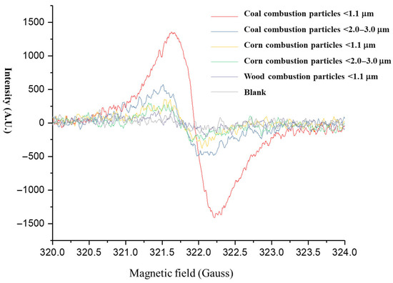 EPR spectroscopy was employed to analyze particulate matter (PM) samples from diverse combustion sources (Figure 5), focusing on equivalent particle-size fractions to ensure comparability [71,72,73]. Unique EPR spectral features were observed across different combustion sources, reflecting variations in radical physicochemical properties (e.g., g-values, linewidths, and signal intensities). For example, coal combustion particles exhibited notably stronger EPFR signals compared to biomass-derived particles at similar particle sizes (Figure 5) [74,75,76]. Coal-derived EPFRs showed higher g-values (2.0046), indicative of oxygen-centered radicals, aligning with abundant oxygen-functional groups in low-rank coal [76]. Biomass EPFRs (e.g., corn, wood) displayed lower g-values (2.0039–2.0041) that are consistent with carbon-centered radicals stabilized by lignin-derived aromatic structures or humic-like substances [76]. Formation of EPFRs was primarily influenced by humic-like substances (HULIS-C) (Equation (6)):