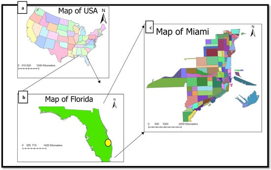 Maps of study area: (a) contiguous USA, (b) map of Florida, (c) map of Miami showing different town boundaries.