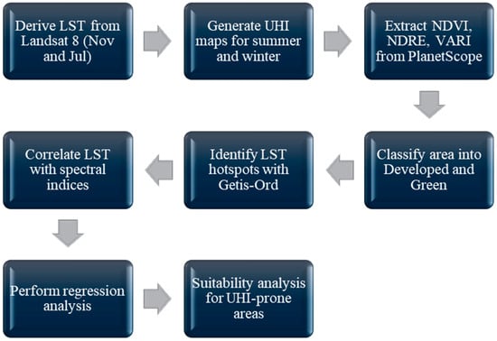 Urban heat islands are areas with above-average LSTs. Urban heat island intensity is defined as the metric for calculating anomalies of temperature within urban areas [].