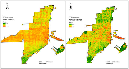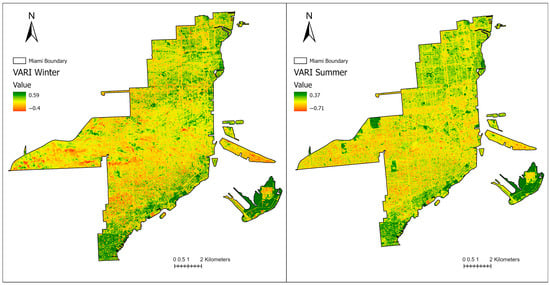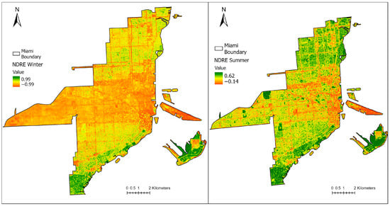 The spectral indices for Miami were computed for the winter (November) and summer (July) of 2023. Figure 4, Figure 5 and Figure 6 display the VARI (Visible Atmospherically Resistant Index), NDRE (Normalized Difference Red Edge Index), and NDVI (Normalized Difference Vegetation Index) for both seasons. Figure 4 illustrates the VARI values during winter, ranging from −0.4 to 0.59, and summer, ranging from −0.71 to 0.37. Despite some areas in Miami showing increased greenness in summer, overall greenness is more prominent in the winter VARI images.