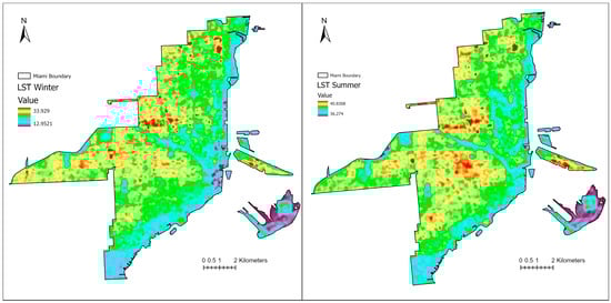The land surface temperature (LST) and urban heat island (UHI) raster analyses for Miami in 2023 present distinct seasonal variations with significant differences in the winter and summer. The LST raster in Figure 7 indicates a sharp contrast between winter and summer conditions. In winter, the LST ranged from 12.95 to 33.92 °C, with milder temperatures across the region []. The LST at the start of summer, however, showed considerably higher values ranging from 36.27 to 40.83 °C. This increment, especially in urban areas, suggests that heat-absorbing surfaces like asphalt, concrete, and buildings overrun the natural cooling effect of nearby water bodies. The evident increase in summer temperatures is obvious given Miami’s subtropical climate, but the higher LST values even in areas adjacent to water bodies suggest that heat retention in urban regions may overshadow the moderating cooling effect of water during hotter seasons [,]. This could mean the presence of heat-absorbing surfaces such as asphalt, concrete, and buildings contributes to higher LST values and worsens the urban heat effect during the summer season []. The UHI analysis in Figure 8 further reinforces these findings. During summer, UHI values ranged from 12.83 to 18.99, indicating significant heat island formation for many parts of the study area. The presence of spiked UHI values suggests the urban areas are intensifying the heat stress in Miami, especially during the hottest months []. In contrast, UHI values during winter ranged from −32.61 to −30.82 in the southwestern and eastern parts of the city. The role of water bodies is crucial in shaping Miami’s UHI patterns. Areas near the coastlines and water features consistently showed lower LST and UHI values, underscoring the cooling effects of water bodies. These cold spots buffer the temperature and generate cooling effects. The lower UHI values during winter indicate that in cooler months the urban environment has less impact on temperature elevation. This might be due to reduced solar radiation and reduced heat accumulation. The spatial distribution of UHI values also highlights interesting patterns. In summer, some areas faced both higher and lower UHI values (−1.97 to 12.82), presenting a mix of urban heat pockets and cooler zones []. The cooler zones could be due to green spaces, parks, and proximity to water bodies that provide some neutralizing effect on the intense heat [,,]. In winter, however, lower UHI values dominate, which shows that the built environment retains less heat during cooler periods while natural aspects like vegetation and water bodies might also contribute to overall temperature moderation.