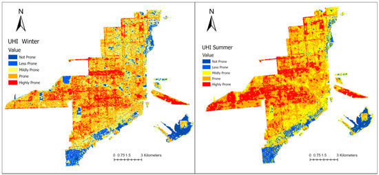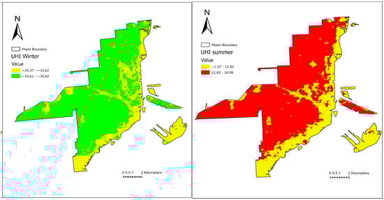 Figure 8 illustrates the UHI rasters for summer and winter in 2023. During summer, UHI values ranged from 12.83 to 18.99 and from −1.97 to 12.82, indicating both higher and lower values across the study area. In contrast, the UHI raster for winter showed lower value ranges from −32.61 to −30.82 and from −35.37 to −32.62. Specifically, in the southwestern and eastern parts of Miami during winter, lower UHI values were observed compared to summer.