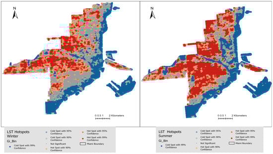Figure 9 depicts the land surface temperature (Gi_Bin) hotspots during the winter and summer of 2023 in Miami, FL. During the summer, hotspots are notably concentrated in the northern and western parts of Miami, whereas they appeared less frequently in the winter. Cold spots were observed predominantly near water bodies and at the periphery of the study area. In summer, hotspots were denser and more concentrated in the central part of Miami, whereas in winter, they appeared sparser in the same locations. The number of cold spots increased during winter compared to summer.