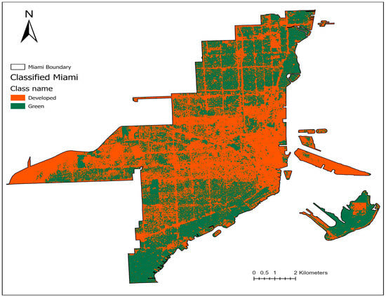 The classification was carried out using the random tree classifier, a method within the random forest classification techniques available in ArcGIS Pro-3.2. The classifier’s default settings included a maximum of 50 trees, a maximum tree depth of 30, and a maximum of 1000 samples per class. After the classification process, the area of Developed land was calculated to be 71.86 km2, while green spaces covered 26.67 km2. The total classified area amounted to 98.53 square kilometers. Miami’s total area, including water bodies, is 145.23 km2; the land area of Miami was estimated to be approximately 94 km2. The land cover map indicates that the study area encompasses 98.53 km2 of land, which can be observed in Table 3.