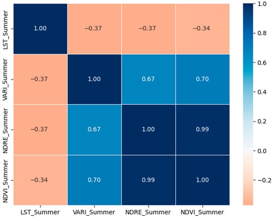 In Figure 11, the correlation matrix displays the relationship between spectral indices and land surface temperature values of 100 points used for the summer season. As expected, vegetation indices showed stronger association between each other in the correlation matrix. The Pearson correlation coefficients (r) for the VARI with the NDRE and NDVI were found to be 0.67 and 0.70, respectively. The correlation between the NDVI and NDRE was found to be 0.99. The correlations between LST for summer and the NDVI, NDRE, and VARI were found to be negatively associated, with values of −0.34, −0.37, and −0.37, respectively, demonstrating an inverse relationship. With increasing temperature, the inverse relationship between vegetation indices and LST for summer was expected.