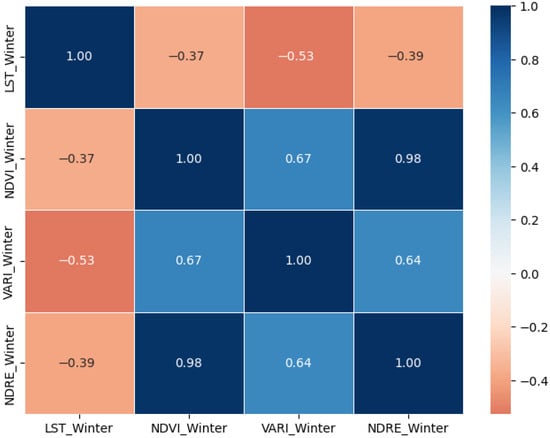Figure 12 presents the correlation matrix between spectral indices and land surface temperature values of 100 points used for the winter season. Vegetation indices showed stronger association between each other in the correlation matrix for winter as well. The Pearson correlation coefficients (r) for the VARI with the NDRE and NDVI were found to be 0.64 and 0.67, respectively. The correlation between the NDVI and the NDRE was found to be 0.98. Correlations between LST for the winter season and the NDVI, NDRE, and VARI were found to be negatively associated, with values of −0.37, −0.39, and −0.53, respectively, demonstrating the inverse relationship. The inverse relationship between spectral indices and LST values was stronger in the winter season than in the summer season.