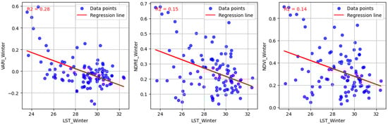 Scatter plot showing linear regression between LST and vegetation indices for winter.