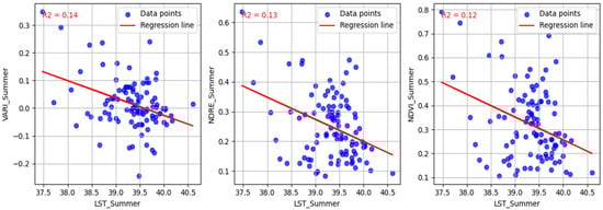 The scatter plot showing linear regression between LST and vegetation indices for summer.