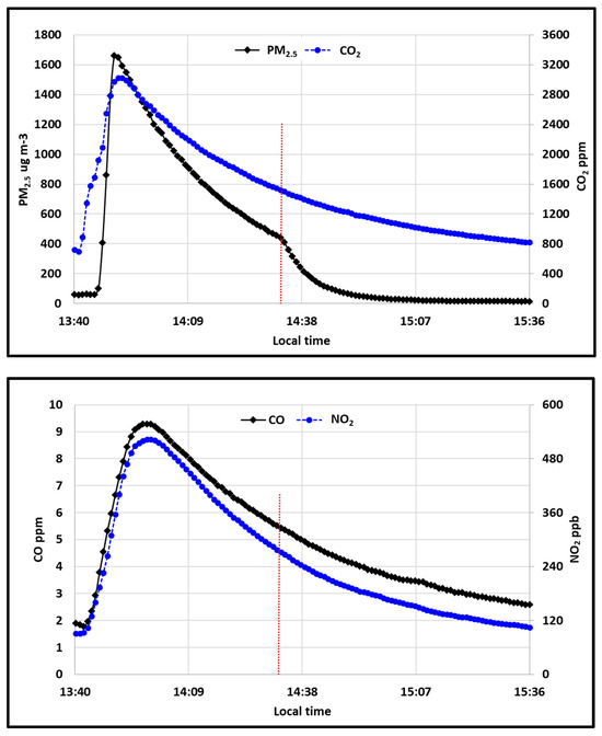 Figure 1. Removal of PM2.5 and CO2, (top) and CO and NO2 (bottom) by ventilation and HEPA filter. The HEPA filtered was initiated at 14:33 (LT), as shown by the vertical line. The data is from volunteer home #20 on 17 November 2024.