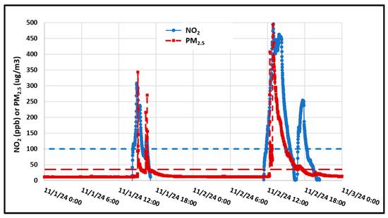 Figure 2. Typical pattern for NO2 and PM2.5 inside one home for 2 days (volunteer home #20). The health thresholds we used are 100 ppb for NO2, shown as blue dashed line, and 35 µg m−3 for PM2.5, shown as the red dashed line.