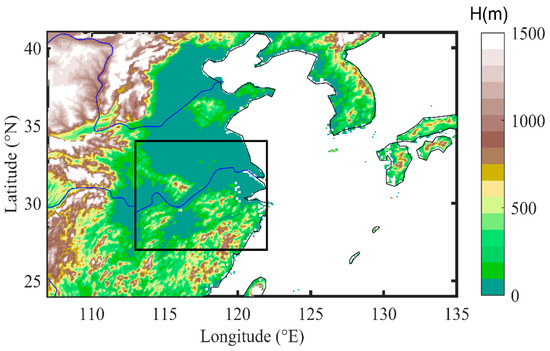 Display of the study area and its surrounding terrain. The black box area is the study area (27−34° N, 113−122° E).