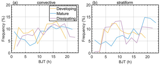 The time distribution of heavy rainfall in the YHRV region during the developing, mature, and dissipating stages for convective (a) and stratiform (b) precipitation. The time is Beijing Time (BJT).