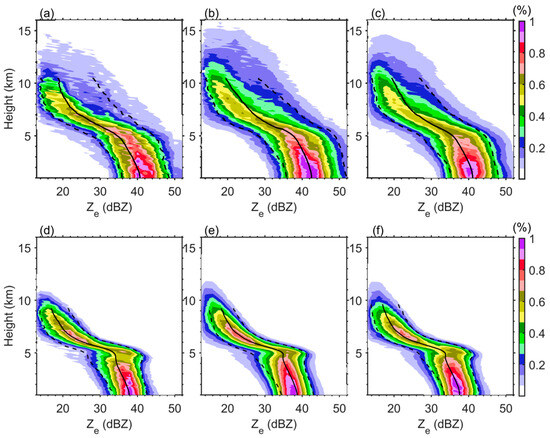 Normalized frequency contoured plots using an altitude diagram showing the frequency distribution of the equivalent radar reflectivity factor for convective heavy rainfall during its developing (a), mature (b), and dissipating (c) stages, and stratiform heavy rainfall during its developing (d), mature (e), and dissipating (f) stages. The solid line represents the average, and the dashed lines represent the 10th and 90th percentiles.