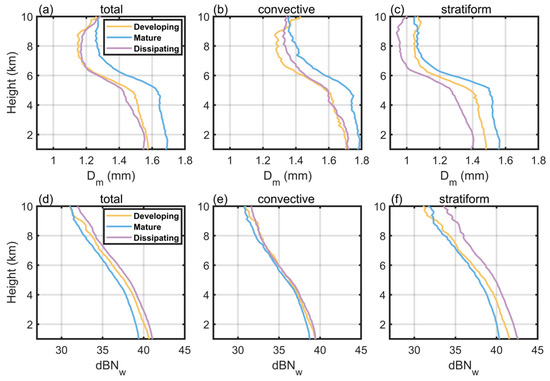 The drop size distribution (DSD) serves as a fundamental microphysical characteristic of rainfall, playing a critical role in characterizing both the vertical structure of precipitation and its microphysical variations. The DSD in GPM DPR is primarily characterized by two key parameters: the mass-weighted mean diameter (Dm, in mm) and the normalized intercept parameter (dBNw). Here, dBNw represents the logarithmic transformation (dBNw = 10log10(Nw)) of the particle number concentration. To illustrate the vertical microphysical structure of Meiyu heavy rainfall in the YHRV region during different stages, Figure 4 presents the vertical structures of the average values of Dm and dBNw for total, convective, and stratiform heavy rainfall. For total heavy rainfall, the Dm is largest during the mature stage, reaching approximately 1.7 mm near the surface, while the dBNw is smallest, only 39 near the surface. In contrast, the Dm is the smallest in the dissipating stage, less than 1.6 mm near the surface, and dBNw is the largest, about 42 near the surface. This differs significantly from the result observed for all rainfall, where the mature stage exhibits the largest dBNw [14]. Since all rainfall includes a substantial proportion of light rain events, where stratiform precipitation dominates, the rainfall intensity during both the developing and dissipating stages remains relatively low. Under these conditions, the particle number concentration is less affected by collision–coalescence processes and is more prone to collision–breakup, resulting in a comparatively higher dBNw in the mature stage.