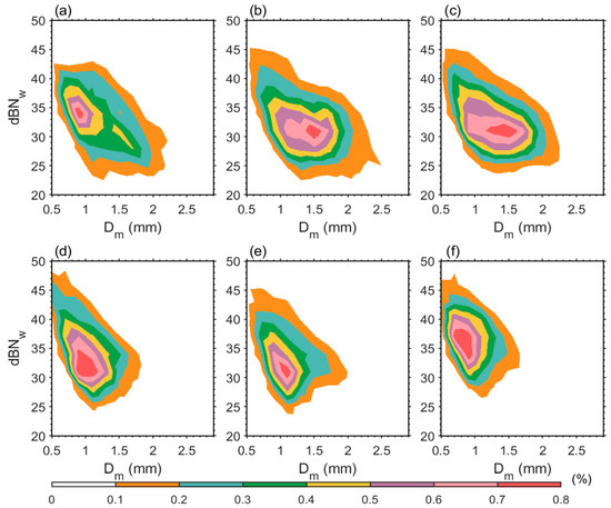 Two-dimensional probability density distributions of Dm versus dBNw above the freezing level for: (a–c) convective heavy rainfall and (d–f) stratiform heavy rainfall during their (a,d) developing, (b,e) mature, and (c,f) dissipating stages.