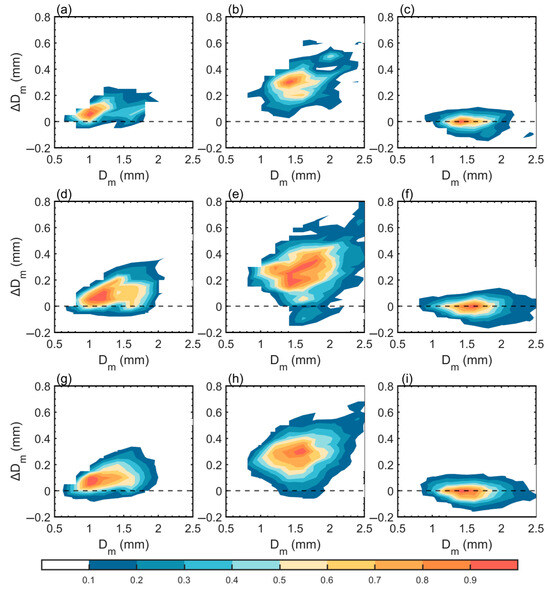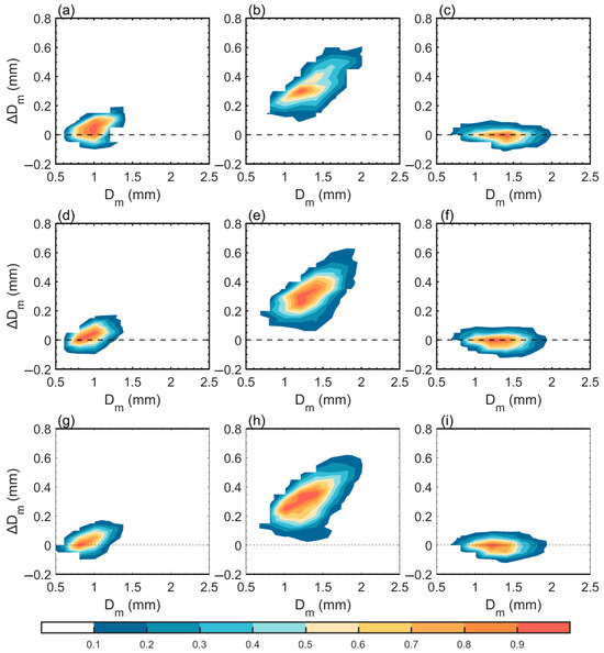 The two-dimensional contoured frequency of ΔDm versus Dm for stratiform heavy rainfall during different stages at altitudes of 8 km (a,d,g), 5 km (b,e,h), and 2 km (c,f,i). The dashed line represents the boundary between the increase and decrease of Dm. The first row represents the developing stage, the second row represents the mature stage, and the third row represents the dissipating stage.