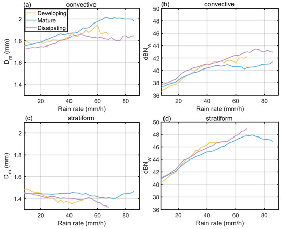 Analysis of rainfall intensity controls reveals stage-dependent relationships between microphysical parameters and precipitation rates that differ by precipitation type. For convective rainfall, synchronous growth of Dm and dBNw occurs during development. The mature stage shows Dm peaking at ~70 mm/h (2.1 mm) while dBNw stabilizes earlier (~50 mm/h at ~40). During dissipation, heavy rainfall (>50 mm/h) exhibits an inverse trend with decreasing Dm (to 1.6 mm) and increasing dBNw (to 43). Stratiform rainfall demonstrates greater sensitivity of dBNw to rainfall intensity compared to convective rainfall, while Dm remains remarkably stable (±0.1 mm variation), confirming that dBNw serves as the primary control on stratiform rainfall intensity, particularly during the development and dissipation stages.