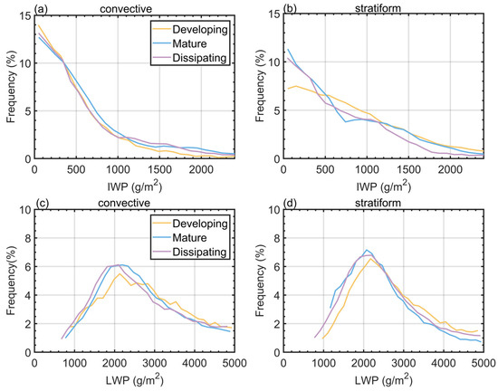 The convective heavy rainfall exhibits distinct characteristics (Figure 9a,c). The distribution curves of IWP show similar features across all stages, while the LWP peaks at 2000 g/m2. During the developing stage, the proportion of IWP exceeding 1000 g/m2 is lower than during the dissipating and mature stages. Conversely, the proportion of LWP exceeding 2800 g/m2 is higher than in the dissipating and mature stages. This indicates that during the developing stage, updrafts promote rapid vapor condensation, leading to a swift increase in LWP, while ice particles in heavy rainfall remain underdeveloped, resulting in relatively lower IWP.