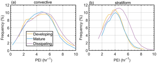 (a) Distribution of PEI for convective heavy rainfall at different stages, (b) distribution of PEI for stratiform heavy rainfall at different stages.