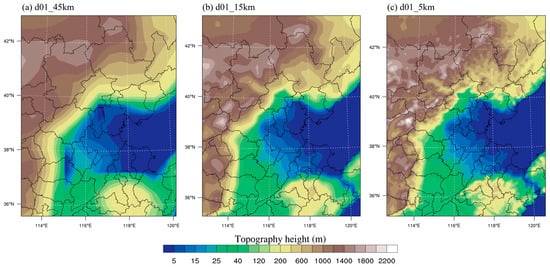 In this study, we use WRF model version 4.5.1 (National Center for Atmospheric Research, Boulder, CO, USA) and employ the default parameterization schemes of the WRF model for simulation (Table 1). The WRF simulation area includes Hebei, Beijing, and Tianjin areas. Three horizontal grid spacings of 45 km, 15 km and 5 km are used in the simulation (Figure 1). The latitude and longitude of the center of the simulation area are 39.3° N and 116.6° E. For the 45 km resolution simulation, 16 grid points are set in the east–west direction and 20 grid points in the north–south direction; for the 15 km resolution simulation, 48 grid points are set in the east–west direction and 60 grid points in the north–south direction; and for the 5 km resolution simulation, 144 grid points are set in the east–west direction and 180 grid points in the north–south direction. The simulations are performed using Lambert projection with a model top layer of 50 hPa and the model output set to once per hour.