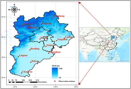 Distribution of observation stations and topographic elevation across Hebei Province, Beijing and Tianjin. Red dots indicate station locations.