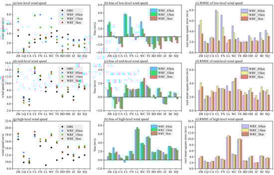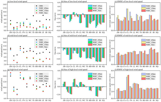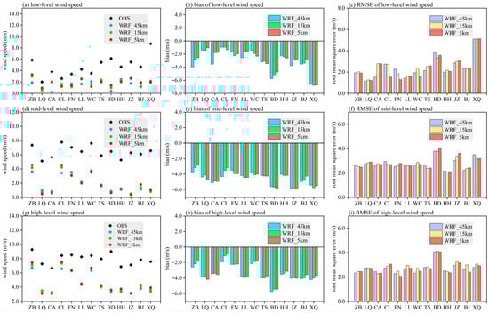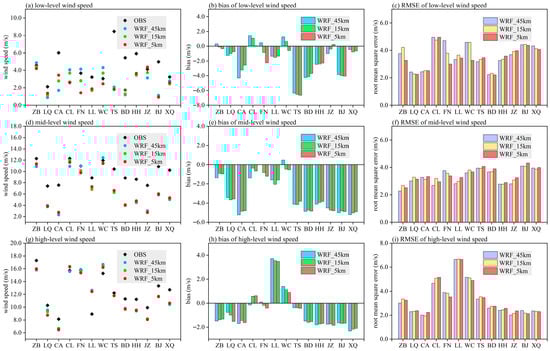Comparison of simulated low-level, mid-level and high-level wind speeds with observed data at three resolutions in spring: (a,d,g) values, (b,e,h) bias, (c,f,i) root mean square error. In the figure, ZB represents Zhangbei station, LQ represents Luquan station, CA represents Cheng’an station, CL represents Chongli station, FN represents Fengning station, LL represents Lulong station, WC represents Weichang station, TS represents Tangshan station, BD represents Baoding station, HH represents Huanghua station, JZ represents Jizhou station, BJ represents Beijing station, and XQ represents Xiqing station.