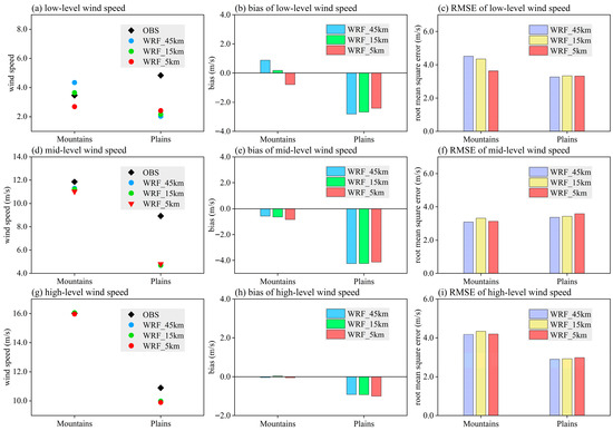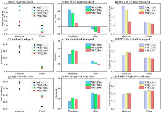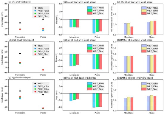 Comparison of simulated low-level, mid-level and high-level wind speeds in mountainous and plain areas with observed data at three resolutions in spring: (a,d,g) values, (b,e,h) bias, (c,f,i) root mean square error.