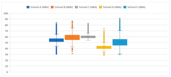 School D exhibits the lowest mean acoustic value, registering at 43.58 dBA, which includes the overall minimum acoustic value recorded at 28.30 dBA and the lowest median acoustic level observed at 41.50 dBA during the baseline assessment when classrooms were not in session. During the school period, School C records the lowest mean and median acoustic levels at 63.14 dBA and 61.70 dBA, respectively, while School D maintains the lowest recorded value at 53.80 dBA. The overall maximum acoustic level measured was 122.50 dBA at School E during the school period.