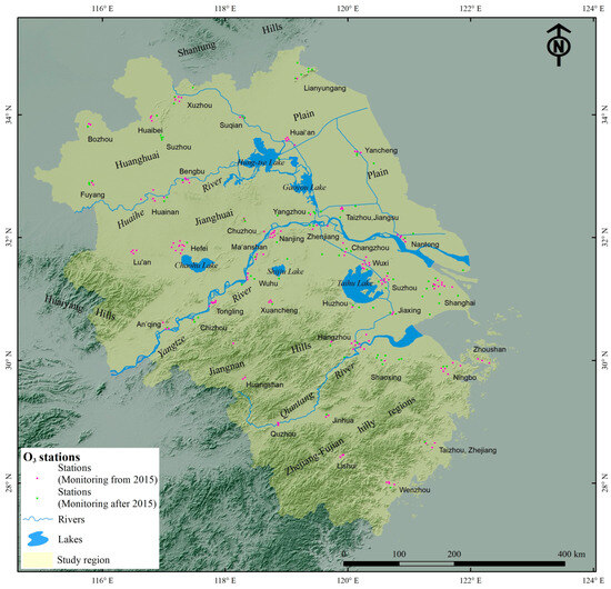 The YRD urban agglomeration encompasses 41 cities across the jurisdictions of Jiangsu, Zhejiang, Shanghai, and Anhui, covering an area of approximately 3.59 × 105 km2. This region lies within the transition zone between subtropical and temperate climates, characterized by an average annual temperature of 15.59 °C and annual precipitation of 1248.8 mm, influenced by the East Asian monsoon [23]. While regional vegetation coverage is considerable, the landforms vary considerably. The southern parts of Jiangsu and Anhui are predominantly characterized by low hills and knolls, shaped by the Jiangnan hills. In contrast, the central and northern sections, including Shanghai, consist mainly of low plains formed by the Huang-Huai Plain and the Jiang-Huai Plain. Zhejiang Province features rugged terrain with the Zhe-Min Hills and includes mountains exceeding 1000 m in elevation, such as the Tianmu, Jiulong, Yandang, and Kuaiji Mountains (Figure 1). The YRD urban agglomeration is demographically and economically significant, with a population of 237 million. Its transportation infrastructure includes 59.84 million privately owned vehicles, and the regional economy contributes approximately 24% to China’s GDP, of which industrial activities account for 40% [24]. Amid China’s escalating ground-level O3 pollution crisis, the YRD urban agglomeration has emerged as one of the four principal hotspots for O3 pollution in eastern and central China [1].