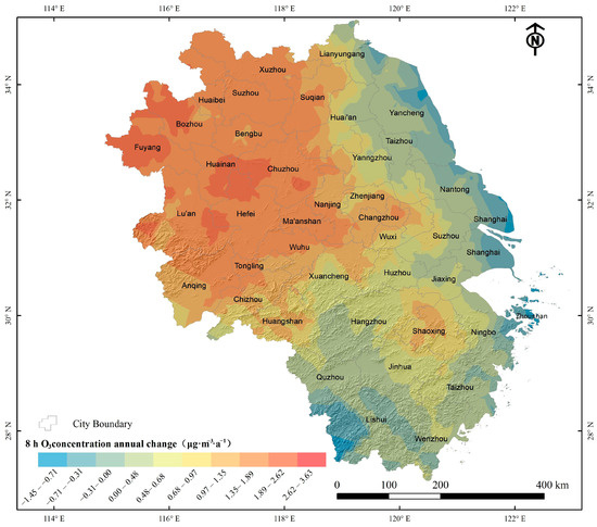 The Action Plan for the Prevention and Control of Air Pollution has achieved notable success in reducing certain pollutant concentrations across the YRD urban agglomeration [15]. However, concurrent monitoring data from 2015 to 2024 indicated a contrasting trend in ground-level 8 h O3, which increased at an average rate of 0.91 ± 0.98 μg·m−3·a−1 (Table 1), consistent with nationwide patterns of 8 h O3 elevation [14]. Seasonal variations in 8 h O3 growth rates were pronounced, with spring exhibiting the highest increase at 1.14 ± 1.41 μg·m−3·a−1, followed by autumn at 0.94 ± 1.12 μg·m−3·a−1 and summer at 0.82 ± 1.41 μg·m−3·a−1, while winter showed the most modest rise at 0.65 ± 0.83 μg·m−3·a−1, representing only 57% of the rate observed in spring.