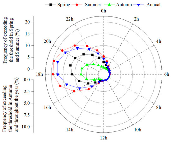 The average frequency of 8 h O3 concentration exceeding standards at various stations in the YRD urban agglomeration on an annual scale was consistent with the hourly concentration variation trend, showing a unimodal characteristic (Figure 5), with a peak value of about 9% occurring mostly between 18:00 and 20:00, while the trough, with values below 1%, was distributed from 02:00 to 14:00, indicating that the regional 8 h O3 concentration exceedances were significantly influenced by the diurnal temperature variation process. The periods in summer when the 8 h O3 concentration exceedance frequency was greater than 1% were from 14:00 to 03:00, accounting for about 60% of the duration, particularly from 18:00 to 20:00, where the exceedance frequency was approximately 20%, suggesting that the public should try to reduce outdoor activities [37]. In spring, the duration when the concentration exceedance frequency was greater than 1% accounts for about 46%, while in autumn, the hourly exceedance frequency was consistently below 4%, mostly occurring from 17:00 to 20:00.